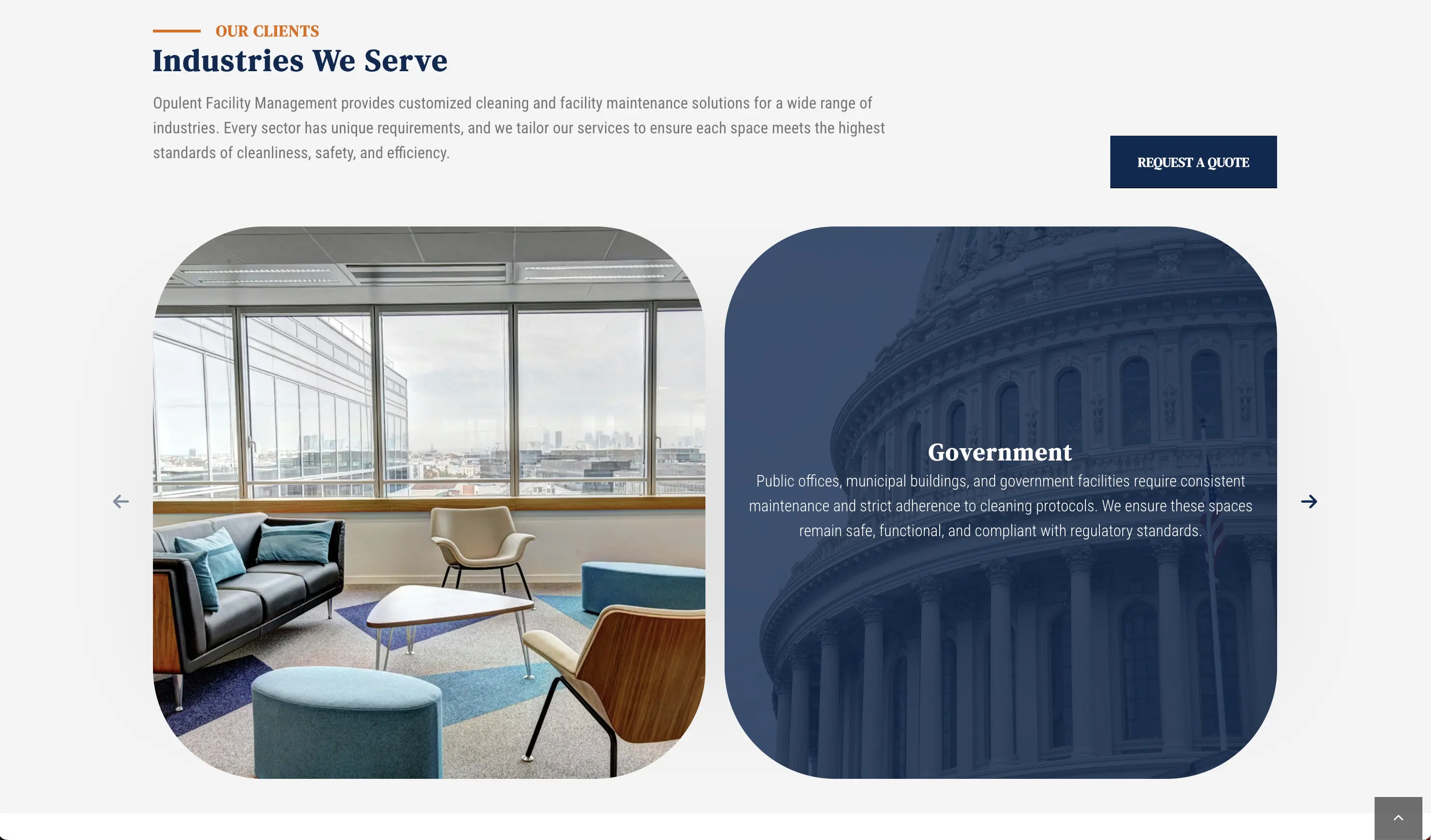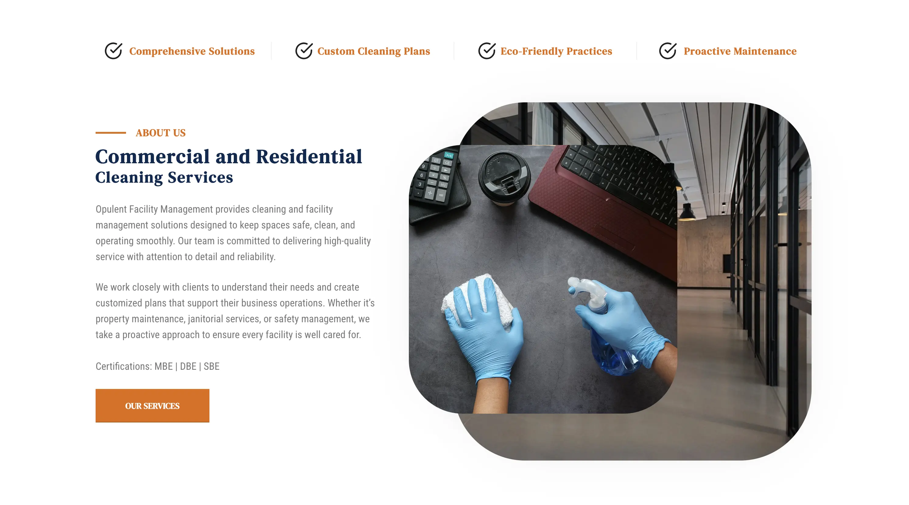 The clean, professional design balances bold imagery with clear service descriptions, organized into intuitive sections that guide visitors from understanding Opulent's offerings to requesting a quote. Every element, from the navy and orange color palette to the layout choices, reinforces Opulent's positioning as a trustworthy, established facility management partner.