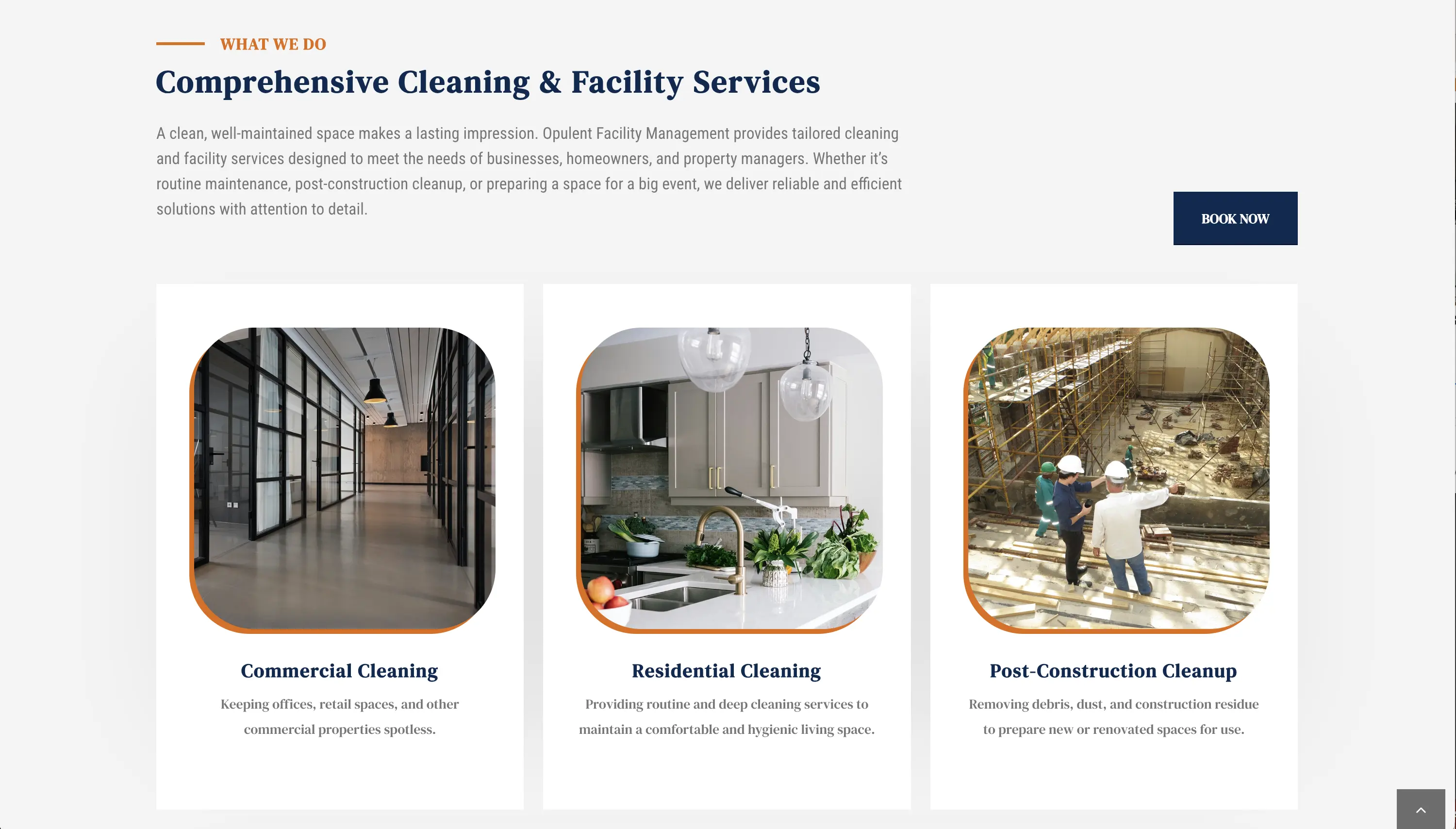 Opulent came to us needing a professional, one-page website for their New York-based cleaning and facility maintenance company. As a new business serving commercial and residential clients across the city, they needed a website that could clearly communicate their comprehensive services while projecting the reliability and professionalism the brand promised.