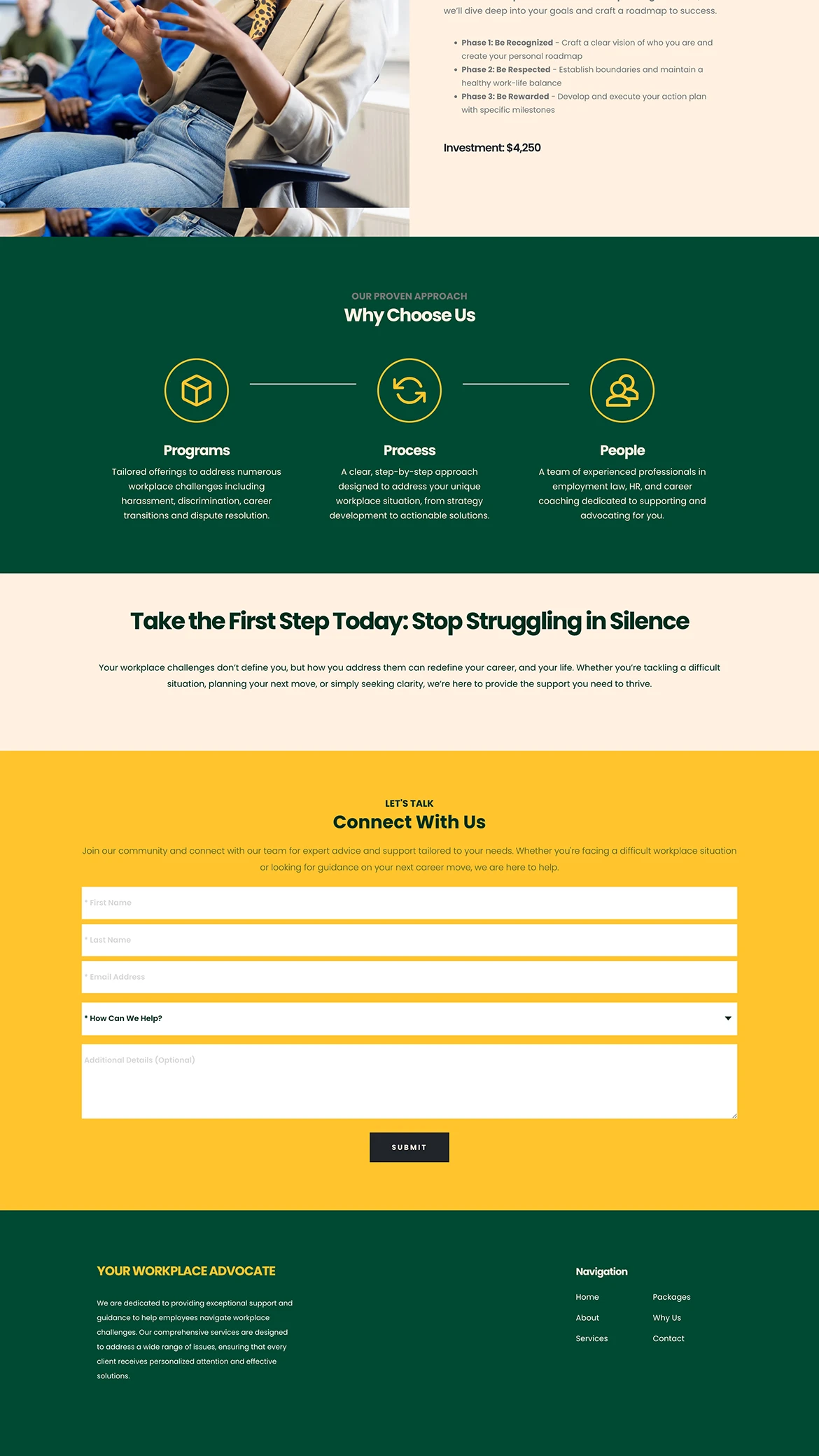 A recovering employment attorney and HR executive came to us with a vision: to create Your Workplace Advocate, a platform empowering employees to navigate workplace challenges and assert their rights. After years in corporate law, she was ready to launch her own practice helping marginalized populations and anyone facing discrimination, harassment, or workplace disputes. She needed a website that would establish her credibility, communicate her comprehensive services, and provide a welcoming space for people seeking support during difficult times.