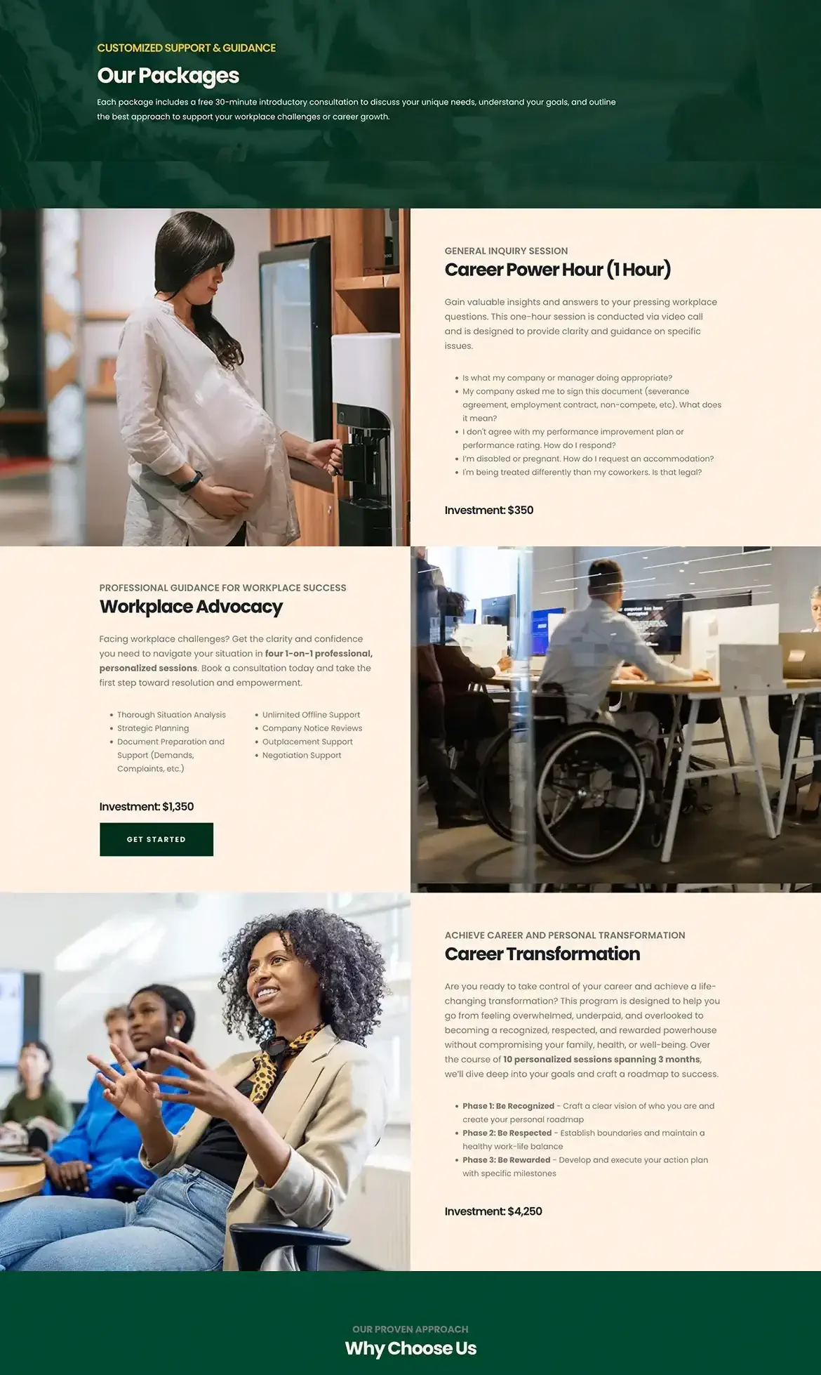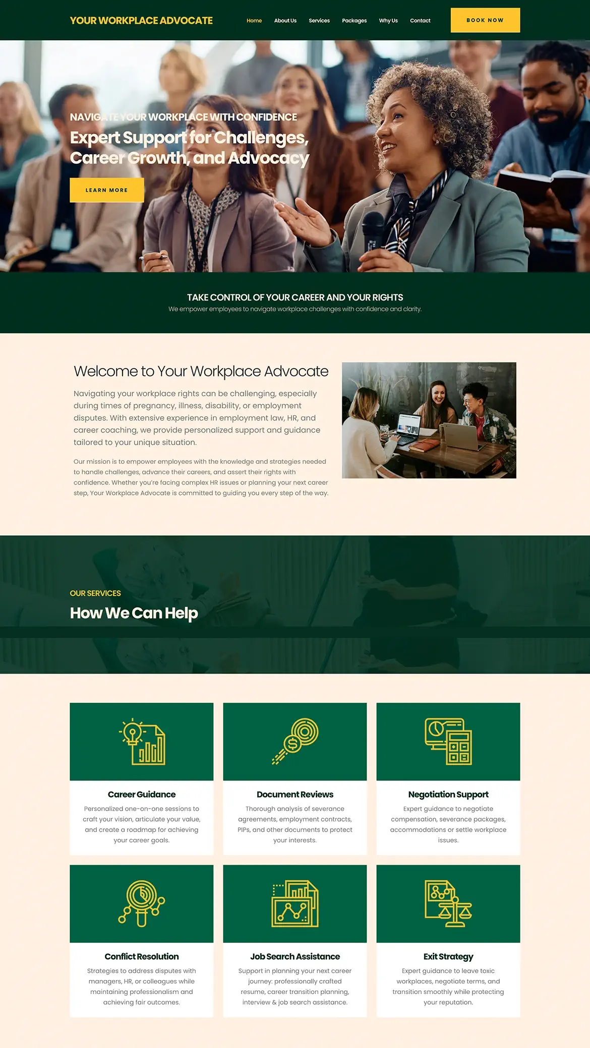 We delivered a professional, conversion focused website that positions Your Workplace Advocate as a trusted partner for employees navigating complex workplace situations. The clean design and strategic layout make it effortless for visitors to understand the services offered and take the next step toward getting help. With a foundation in place for collecting newsletter subscribers and booking consultations, she can now focus on what she does best: empowering employees to reclaim their rights and thrive in their careers.